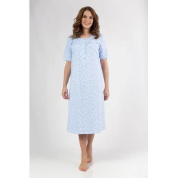 Dámská košile z jemné vzorované bavlny. Krátký rukáv, mírně nařasený výstřih, zapínání na knoflíky. Délka ke kolenům.