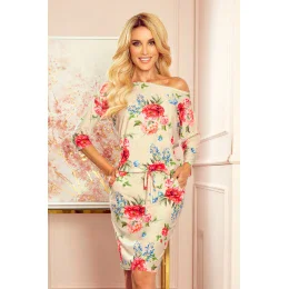 Dámské sportovní šaty s 3/4 rukávy, kapsičkami a potiskem - béžový len a červené květy.