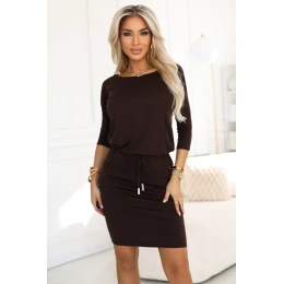 Sportovní šaty značky Numoco v čokoládově hnědé barvě. Jsou vyrobeny z měkkého, pružného úpletu, mají 3/4 rukávy, kapsy a zavazování v pase, které zvýrazňuje pas. Jsou stylové, pohodlné a ideální pro každodenní nošení. polský výrobek.