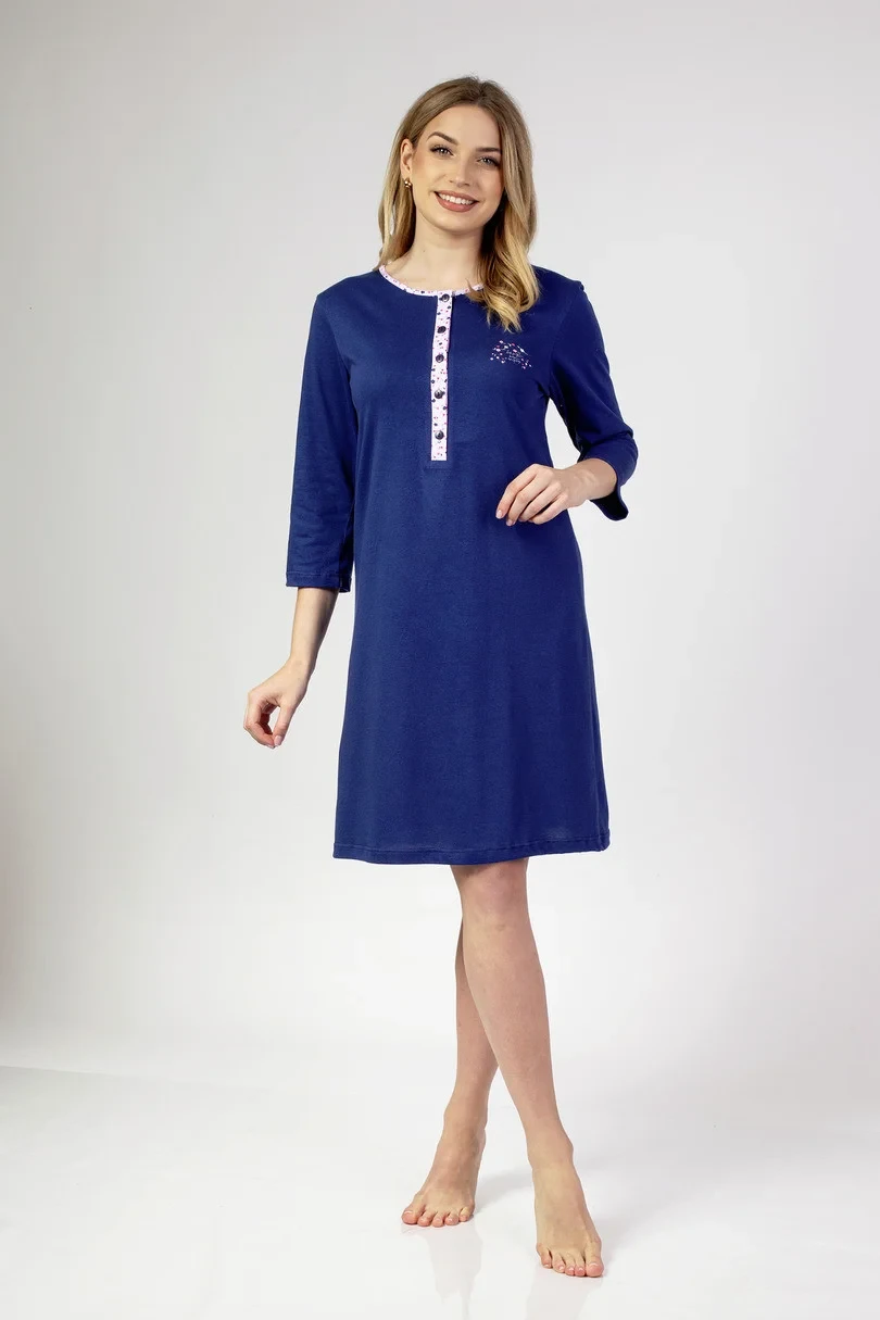 Dámská košile s 3/4 rukávy z jemné bavlny, zapínání vpředu na knoflíky, kulatý výstřih, délka před kolena.