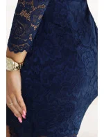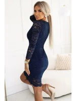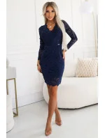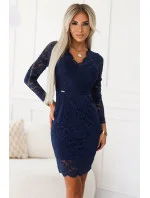 170-15 Krajkové šaty s dlouhými rukávy a výstřihem - tmavě modrá barva