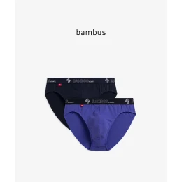 Dwupak slipów męskich w kolorze granatowym i fioletowym. Ich stan jest niski, a boki dość wąskie, mają sportowy charakter. W talii slipy zaznaczone są miękką gumą zewnętrzną, na której znajduje się sporych rozmiarów napis BAMBOO, logo ATLANTIC i nowoczesna grafika. Przyjemna w dotyku guma nie uciska ciała i nie wbija się w skórę, gwarantuje tym samym użytkownikowi maksymalny komfort noszenia. Do wykonania slipów sięgnęliśmy po dzianinę, która jest połączeniem delikatnego i jedwabistego bambusa, przyjemnej w dotyku bawełny oraz rozciągliwego elastanu. Przyjazna dla skóry dzianina w upały daje uczucie chłodu, a zimą ociepla. Swoje wyjątkowe właściwości zachowuje na długo.
