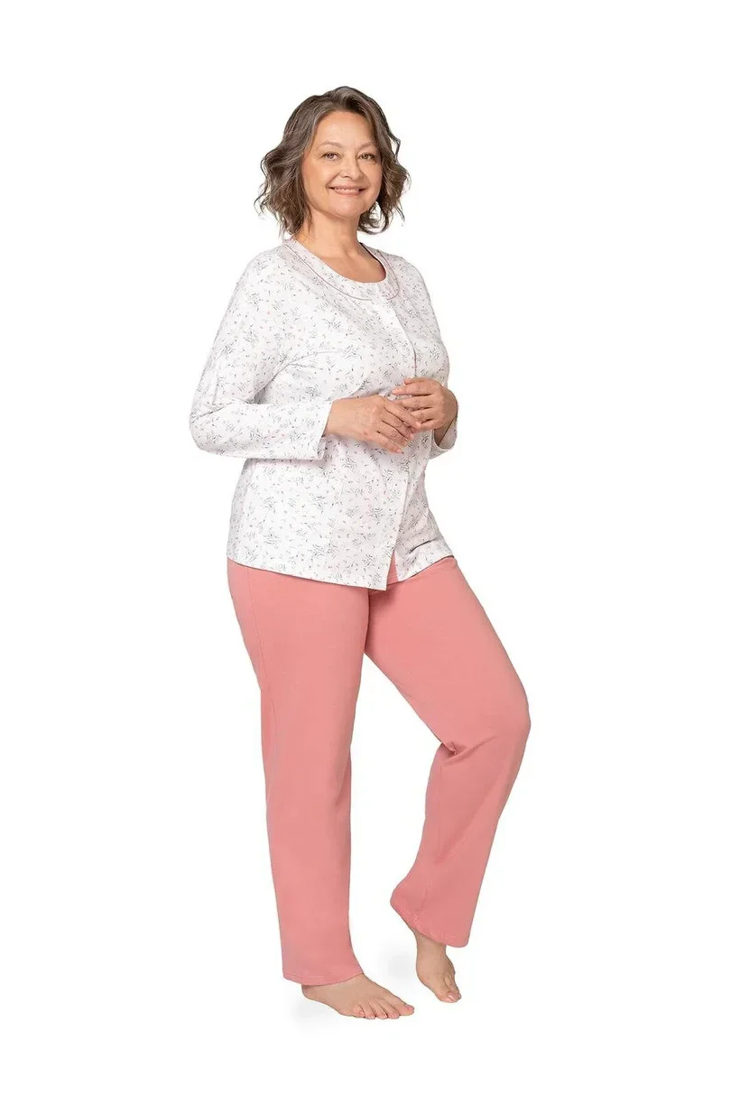 Dámské pyžamo Maria 202 je dokonalou kombinací pohodlí a elegance pro každé roční období. Je vyrobeno ze 100% vysoce kvalitní bavlny, je měkké, prodyšné a šetrné k pokožce. Tričko s dlouhými rukávy, vzorovaným vzorem a kulatým výstřihem poskytuje stylový vzhled, zatímco rozepínání na celé knoflíky usnadňuje oblékání. Jednotné dlouhé kalhoty s pohodlným elastickým pasem zaručují volnost pohybu a perfektně padnou. Jedná se o dokonalou volbu pro ženy, které ocení pohodlí a klasický styl!
