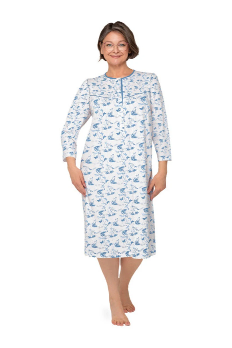 Dámská košile s dlouhými rukávy ušitá z jemné vzorované bavlny s digitálním potiskem. Otevřený výstřih, řasení na prsou, délka košile ke kolenům.