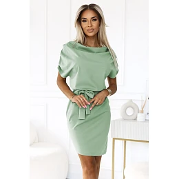 Pistáciové tužkové šaty značky Numoco s uvázaným páskem, krátkými rukávy a délkou před kolena. Polská výroba.