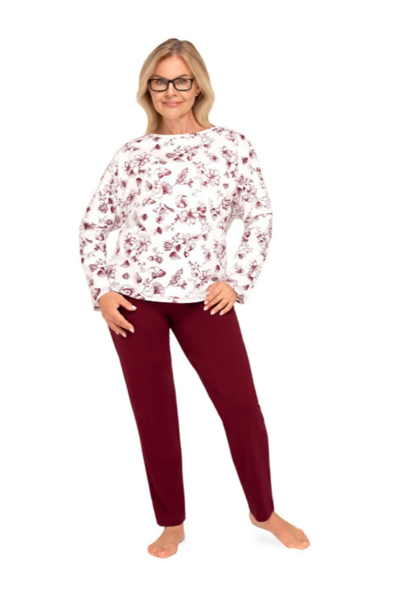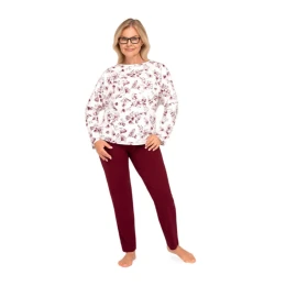 Vrchní část pyžama tvoří vzorované tričko s dlouhými rukávy a kulatým výstřihem, které krásně sedí na siluetě. Soupravu doplňují dlouhé jednotné kalhoty, které vytvářejí harmonický a elegantní celek.