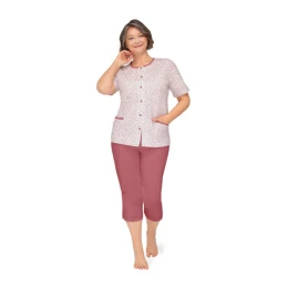 Piżama damska KASIA I 265 to wygodny, praktyczny komplet na cieplejsze dni. Wykonana w 100% z naturalnej bawełny, zapewnia doskonałą przewiewność i komfort noszenia. Bluzka z krótkim rękawem posiada okrągły dekolt, dwie funkcjonalne kieszenie i pełne rozpięcie na guziki, co czyni ją również świetnym wyborem dla mam karmiących. Krótkie spodenki z elastyczną gumką w pasie idealnie dopasowują się do sylwetki. Produkt pochodzi od polskiego producenta, co gwarantuje wysoką jakość wykonania.