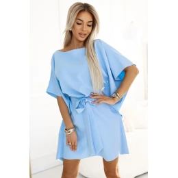Elegantní, vzdušné šaty se zavazováním v pase, vyrobené z vysoce kvalitní látky ve světle modré barvě. Polská výroba, značka Numoco.