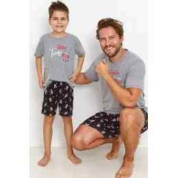 Bavlněné chlapecké pyžamo, tričko zdobené potiskem. Doplněno krátkými vzorovanými kalhotami.