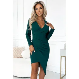 290-3 Asymetrické šaty s dlouhými rukávy, výstřihem a řasením - ZELENÉ