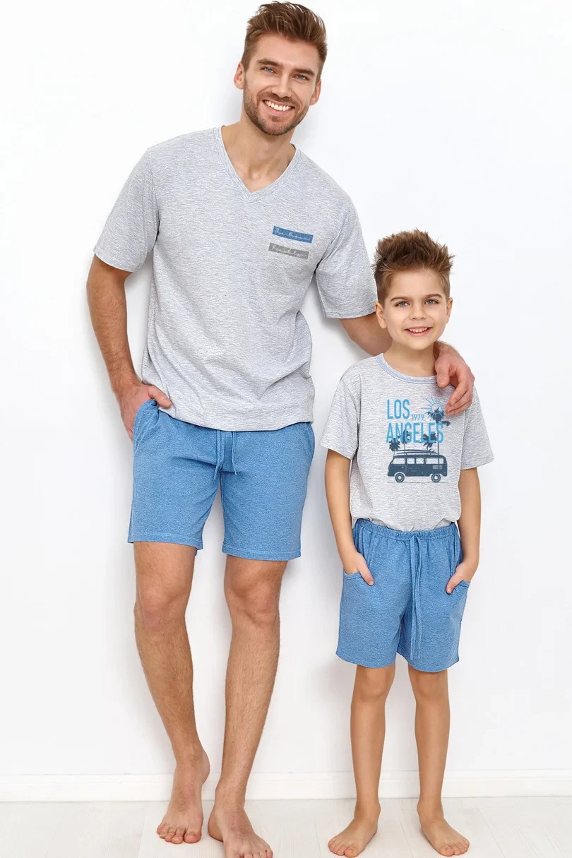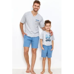 Bavlněné chlapecké pyžamo, tričko s krátkým rukávem zdobené potiskem. Doplněno pevnými šortkami s kapsami.
