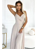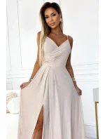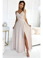 Chiara - elegantní maxi dlouhé třpytivé šaty. Krásně tvarovaný výstřih a rozparek na sukni vytvářejí nevšední kompozici. Vyrobeno z brokátu, elastický materiál v béžové barvě. Šaty se skvěle hodí na svatbu, Silvestra, ples, karneval a jiné významné události. Vyrobeno v Polsku firmou Numoco.