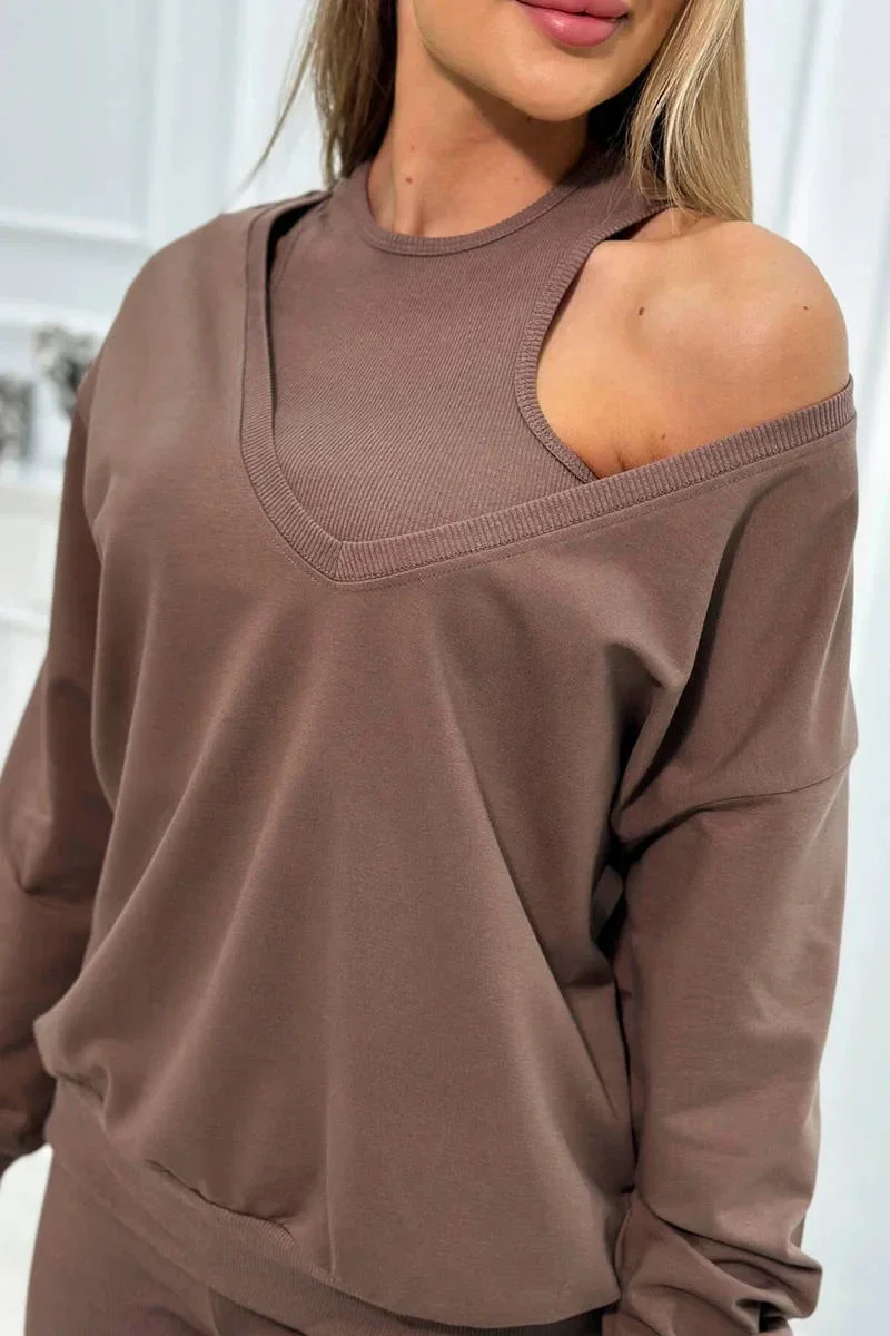 Představujeme vám třídílnou sadu. Souprava se skládá z mikiny, přiléhavého žebrovaného topu a legín s vysokým pasem. Nahoru a legíny jsou vyrobeny z žebrovaného materiálu. Sada je vyrobena z vysoce kvalitního materiálu. Velikost je univerzální a vyhovuje dámám velikosti S nebo M.