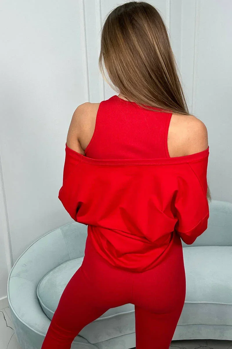 Představujeme vám třídílnou sadu. Souprava se skládá z mikiny, přiléhavého žebrovaného topu a legín s vysokým pasem. Nahoru a legíny jsou vyrobeny z žebrovaného materiálu. Sada je vyrobena z vysoce kvalitního materiálu. Velikost je univerzální a vyhovuje dámám velikosti S nebo M.