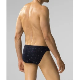 W 3-packu znajdziesz dwie pary granatowych slipów męskich pokrytych maleńkimi, graficznymi wzorkami oraz jedną parę gładkich majtek w kolorze niebieskim. Slipy o sportowym kroju mają niską talię, w której zaznaczone są miękką i nieuciskającą ciała gumą ozdobioną logo Atlantic. Majtki mają też dość mocno podcięte boki, tym samym świetnie eksponują nogi.