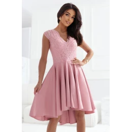 Elegantní růžové šaty s krajkovým vrškem a rozšířenou, asymetrickou spodní částí. Ideální na svatbu, večírek nebo romantické rande. Polský výrobek značky Numoco.