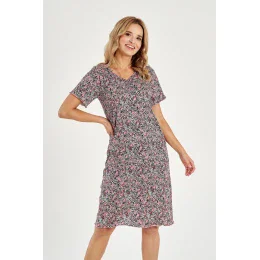 Dámské tričko s krátkým rukávem ušité ze vzorované jemné bavlny. Košile s výstřihem do V a délkou ke kolenům.