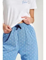 Dámské pyžamo s krátkým rukávem ušité z jemné pevné bavlny, jemný potisk na úrovni hrudníku. Kulatý výstřih. Doplňují je dlouhé kalhoty s módním potiskem.