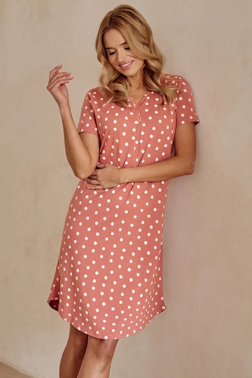 Dámská košile s krátkým rukávem z jemné bavlny s hráškovým vzorem. Lícní výstřih se zapínáním na knoflíky. Délka košile ke kolenům.