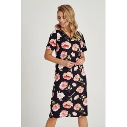 Dámské tričko s krátkým rukávem ušité ze vzorované jemné bavlny. Výstřih do V, košile v délce ke kolenům.