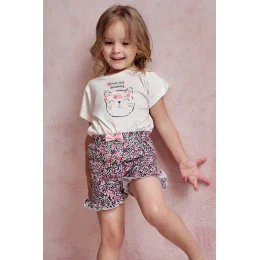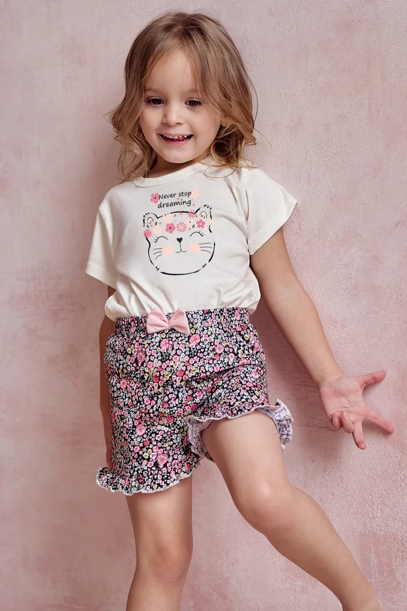 Dívčí bavlněné pyžamo, tričko s krátkým rukávem zdobené potiskem. Doplněné krátkými vzorovanými šortkami.
