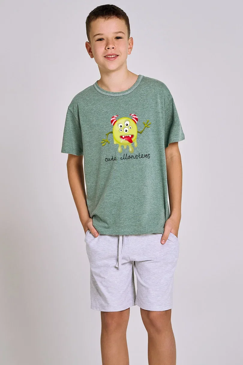 Klasické chlapecké pyžamo s krátkým rukávem, vyrobené z bavlny, tričko s barevným potiskem na přední straně, kulatý výstřih. Doplněno pevnými krátkými šortkami s kapsami a šňůrkou na stažení pro nastavení.