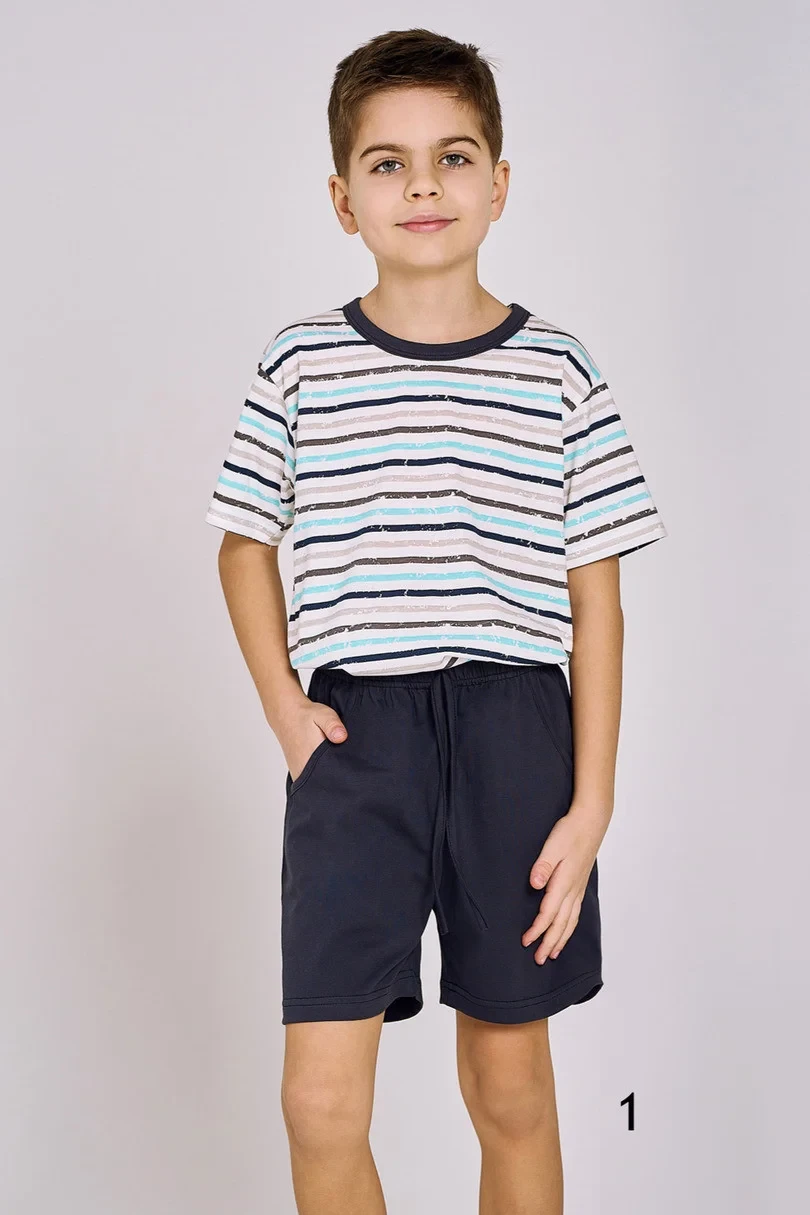 Klasické chlapecké pyžamo s krátkým rukávem, vyrobené z bavlny, pruhované tričko, kulatý výstřih. Doplněno pevnými krátkými šortkami s kapsami a šňůrkou na stažení pro nastavení.