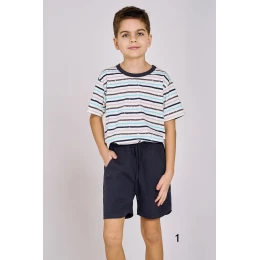 Klasické chlapecké pyžamo s krátkým rukávem, vyrobené z bavlny, pruhované tričko, kulatý výstřih. Doplněné pevnými krátkými šortkami s kapsami a nastavitelnou šňůrkou.