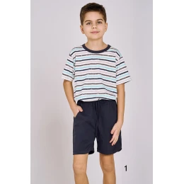 Klasické chlapecké pyžamo s krátkým rukávem, vyrobené z bavlny, pruhované tričko, kulatý výstřih. Doplněné pevnými krátkými šortkami s kapsami a nastavitelnou šňůrkou.