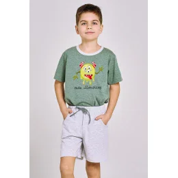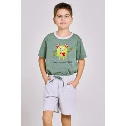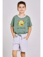 Klasické chlapecké pyžamo s krátkým rukávem, vyrobené z bavlny, tričko s barevným potiskem na přední straně, kulatý výstřih. Doplněné pevnými krátkými šortkami s kapsami a nastavitelnou šňůrkou.