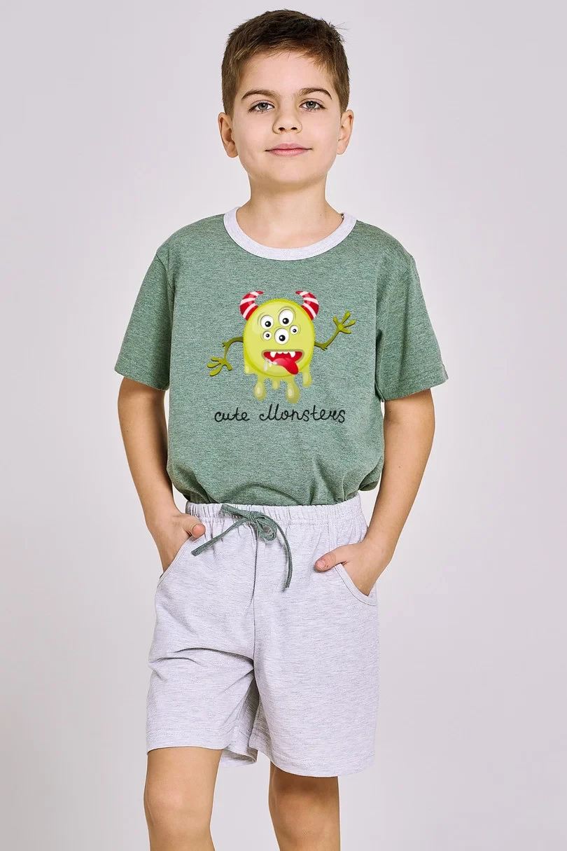 Klasické chlapecké pyžamo s krátkým rukávem, vyrobené z bavlny, tričko s barevným potiskem na přední straně, kulatý výstřih. Doplněné pevnými krátkými šortkami s kapsami a nastavitelnou šňůrkou.