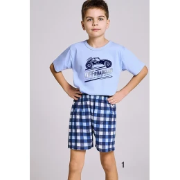 Chlapecké bavlněné pyžamo, tričko s krátkým rukávem zdobené potiskem. Doplněné krátkými kostkovanými šortkami.