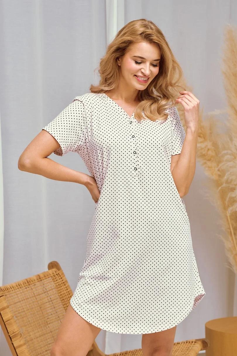 Noční košile s krátkými rukávy, otevřeným výstřihem a mírně zaobleným spodním lemem.