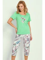 Dámské pyžamo z jemné bavlny, tričko s krátkým rukávem, přední díl s potiskem, kulatý výstřih, 3/4 dlouhé vzorované kalhoty.
