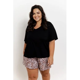 Dámské pyžamo s krátkým rukávem, jednobarevná halenka s výstřihem, krátké šortky s leopardím vzorem.