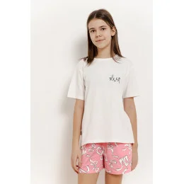 Piżama dziewczęca Nelly od Taro to doskonały wybór na ciepłe noce i leniwe poranki. Wykonana w 100% z wysokiej jakości, miękkiej bawełny, zapewnia komfort i przewiewność. Koszulka z krótkim rękawem ozdobiona jest stylowym, kolorowym napisem, który dodaje jej uroku. Do kompletu dołączone są krótkie, wzorzyste spodenki z praktycznymi kieszeniami na biodrach – idealne na drobiazgi. Całość zapakowana w foliowy woreczek, co ułatwia przechowywanie.