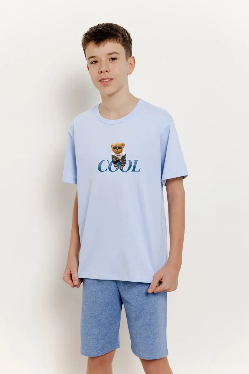 Souprava se skládá z trička s krátkým rukávem, zdobeného barevným potiskem, který dodává chlapecký nádech, a dodává se s krátkými melanžovými šortkami pro pohodlí a volnost pohybu. Je vyrobena z 92 % bavlny a 8 % polyesteru, je lehká, pružná a odolná.