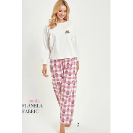 Dámské pyžamo Astrid 3441 je ideální pro chladnější noci. Je vyrobeno ze 100% měkké, prodyšné bavlny a poskytuje přirozený komfort při spánku. Vrchní část pyžama tvoří volné tričko s dlouhými rukávy, kulatým výstřihem a decentním potiskem na hrudi. Spodní část tvoří flanelové kalhoty v módním kostkovaném vzoru s elastickým pasem, který zaručuje volnost pohybu a pohodlí po celou noc.