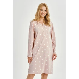 Noční košile Nori 3443 značky Taro je okouzlující a praktickou volbou pro ženy, které si cení pohodlí a romantického stylu. Je vyrobena z vysoce kvalitní bavlny a poskytuje pohodlí a prodyšnost po celou noc. Díky délce ke kolenům, dlouhým rovným rukávům a výstřihu se zapínáním na knoflíky je ideální i pro kojící matky. Potisk srdíček jí dodává jemný ženský nádech.