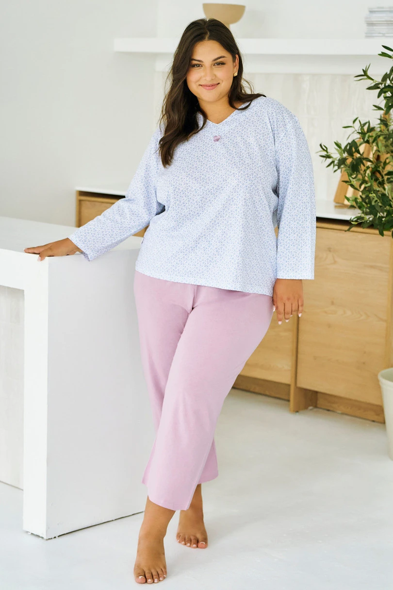 Piżama damska DEBORA 3463 to elegancki komplet stworzony z myślą o kobietach plus size, które cenią komfort i modny wygląd. Górna część zestawu to koszulka z długim rękawem, wykonana z delikatnej, wzorzystej bawełny. Dekolt w kształcie litery "V" ozdobiono subtelną, satynową kokardką, dodając całości kobiecego uroku. Spodnie typu kuloty o długości 7/8 są jednolite, z prostą nogawką i wiązanym sznureczkiem w pasie, dzięki czemu można idealnie dopasować je do sylwetki. Całość uszyta z oddychającej, 100% bawełny.
