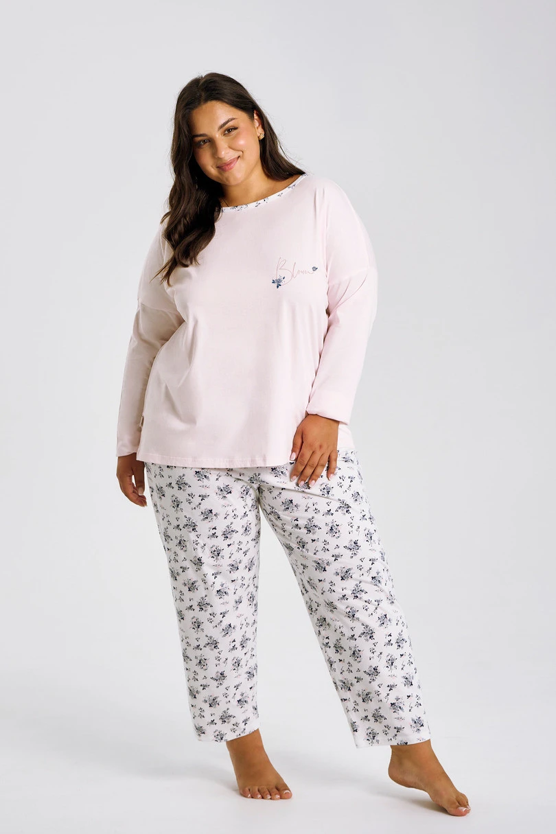 Piżama damska ELLA 3465 od marki TARO to klasyczny, dwuczęściowy komplet idealny dla kobiet ceniących naturalne tkaniny i komfortowy sen. Wykonana w 100% z wysokogatunkowej bawełny, zapewnia miękkość, przewiewność i wygodę przez całą noc. Góra piżamy to bluzka z długim rękawem, ozdobiona subtelnym, kwiatowym wzorem i wykończona półokrągłym dekoltem z jednolitą lamówką. Długie, jednolite spodnie o prostym kroju posiadają elastyczną gumkę w pasie, gwarantując pełną swobodę ruchów i idealne dopasowanie. Doskonały wybór dla kobiet plus size w rozmiarach 2XL–3XL.