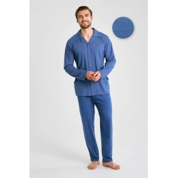 Piżama męska 3484 to elegancka propozycja dla panów, którzy cenią klasyczny styl i komfort użytkowania. Koszula z długim rękawem, rozpinana na guziki, wykończona tradycyjnym kołnierzykiem oraz wyposażona w praktyczne kieszenie na wysokości bioder. Do zestawu dołączone są jednolite, dług