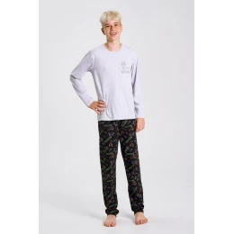 Chlapecká pyžamová souprava 3507 Julio značky Taro je pohodlná souprava určená pro teenagery. Je vyrobena výhradně z přírodní, prodyšné bavlny, je příjemná na dotek a bezpečná pro pokožku. Tričko s dlouhými rukávy a kulatým výstřihem má na přední straně atraktivní potisk, který mu dodává moderní nádech. Kalhoty s dlouhými nohavicemi zdobí zajímavý vzor, zatímco elastický pas zajišťuje volnost pohybu a pohodlné nošení. Toto praktické a módní pyžamo je k dispozici ve velikostech 146–158 a je ideální na spaní i každodenní domácí relaxaci.