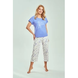 Piżama damska 3533 ELORA to połączenie wygody, naturalnych materiałów i kobiecego wzornictwa inspirowanego naturą. Wykonana w 100% z wysokiej jakości bawełny, jest miękka, przewiewna i przyjazna dla skóry, zapewniając komfort snu oraz domowego relaksu. Koszulka z krótkim rękawem i półokrągłym dekoltem swobodnie układa się na sylwetce, a ozdobny nadruk z przodu dodaje całości stylowego charakteru.
