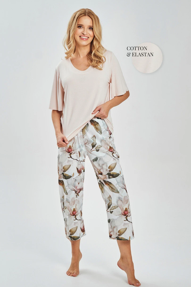 Kalhoty v délce 7/8 zdobí poutavý potisk barevných květin, který pyžamu dodává svěžest a romantiku. Pas je olemován pohodlnou gumičkou lemovanou bavlnou, která zaručuje dokonalé přizpůsobení bez tlaku. Pyžamo AFRODYTA bude ideální jak pro spánek a domácí relaxaci, tak i jako stylový a praktický dárek.