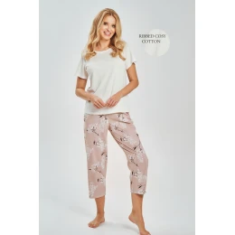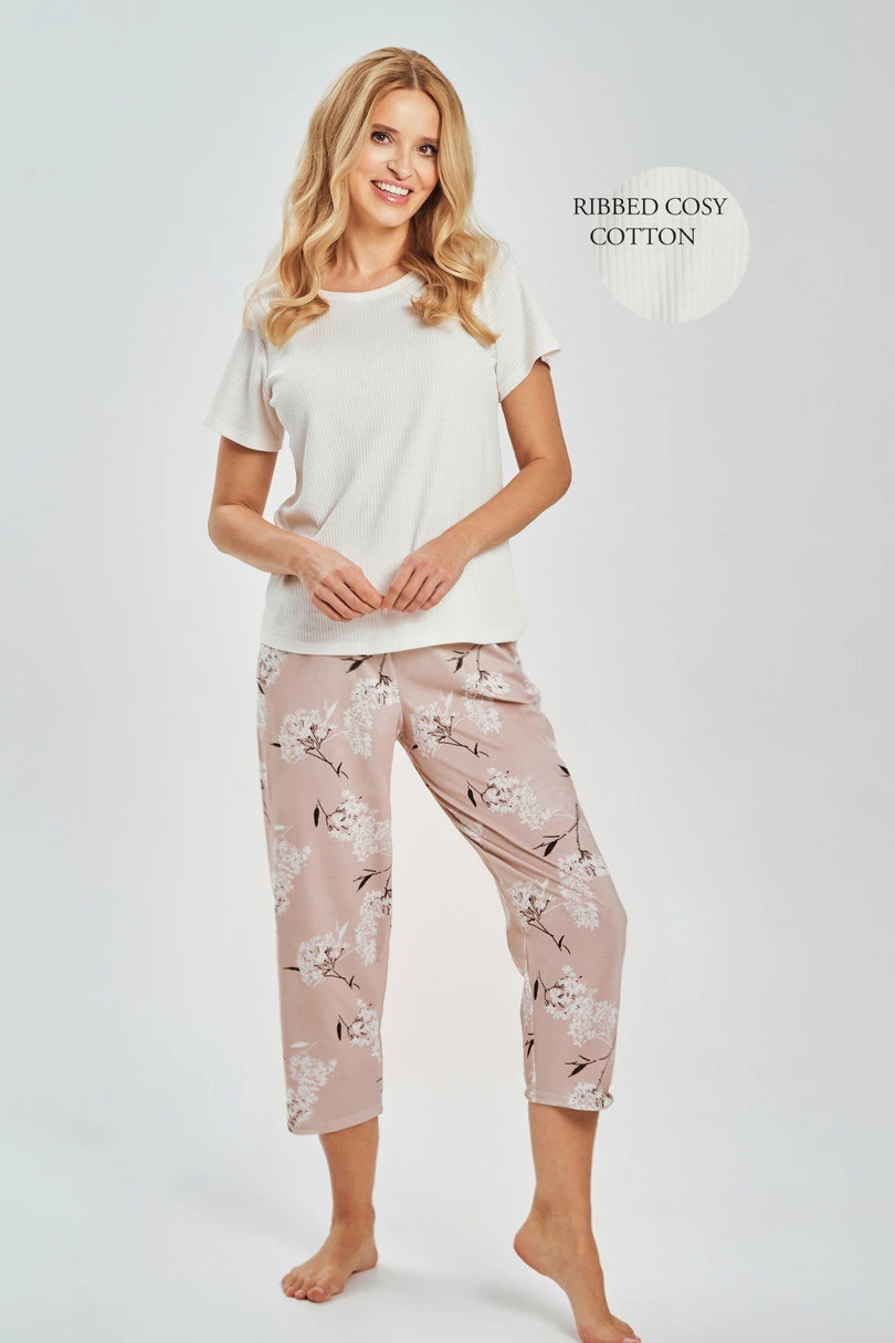 Dámské pyžamo Fiora 3539 S-XL značky TARO je vysoce kvalitní polský výrobek vytvořený pro pohodlí a přirozenou volnost spánku. Je vyrobeno ze 100% měkké, prodyšné bavlny, je příjemné k pokožce a ideální pro teplejší i přechodné noci. Tričko s krátkým rukávem z jednotného žebrovaného úpletu má půlkruhový výstřih, který zajišťuje pohodlí a neomezuje v pohybu. 3/4 dlouhé kalhoty zdobené jemným květinovým potiskem dodávají celku ženský půvab. Elastický pás, lemovaný bavlnou, zaručuje pohodlí a dokonalé přizpůsobení. Jedná se o ideální dámské pyžamo pro spánek a domácí relaxaci.