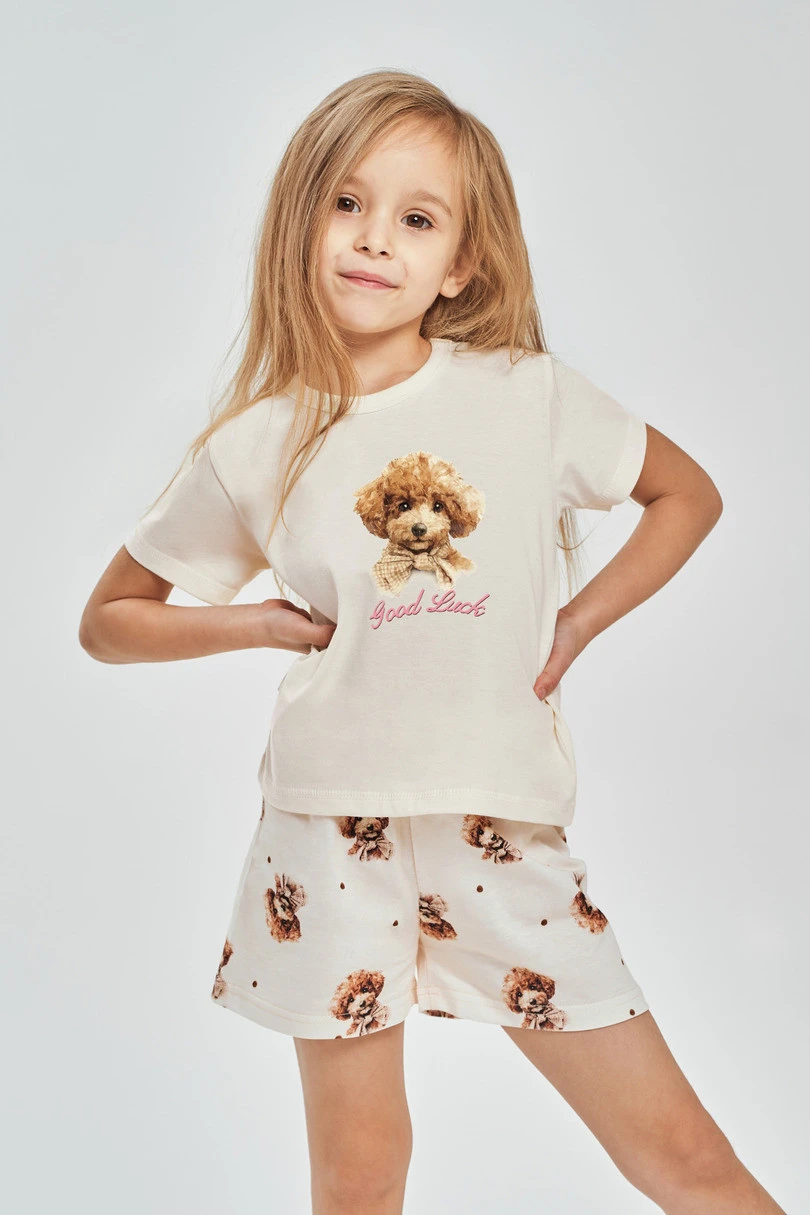 Souprava se skládá z trička s krátkým rukávem, jehož přední stranu zdobí barevný potisk, který dodává pyžamu veselý, dětský charakter. Soupravu doplňují krátké šortky, které zaručují volnost pohybu a vysoký komfort při nošení. Díky přírodnímu materiálu je pyžamo lehké a příjemné na nošení.