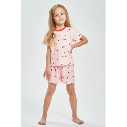 Pyžamo se skládá z trička s krátkým rukávem, zdobeného veselým potiskem jahod, který dodává celé soupravě dívčí šarm. Soupravu doplňují krátké šortky, ideální pro teplejší noci a letní odpočinek. Lehký materiál zajišťuje volnost pohybu a pohodlí po celou noc.