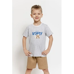 Tričko ve světlé melanžové barvě má kulatý výstřih a roztomilý potisk s medvídkem a nápisem "Don't Worry", který dodává pyžamu dětský charakter. Díky měkké a prodyšné bavlně je materiál příjemný k pokožce a zajišťuje pohodlný spánek.