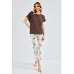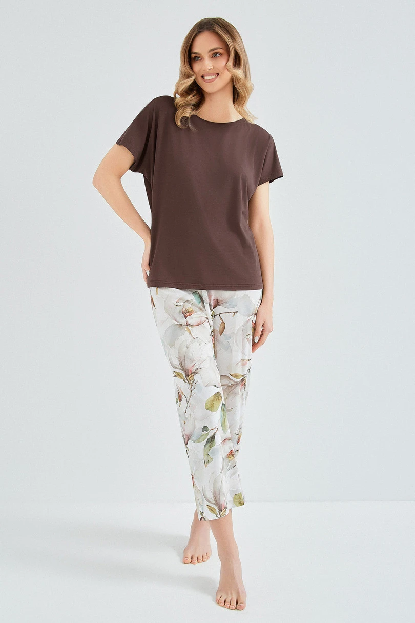 Bavlněné kalhoty v délce 7/8 zdobí ženský květinový potisk, který vnáší svěžest a jemný, romantický nádech. 100% přírodní bavlna je prodyšná a šetrná k pokožce a pohodlný střih zaručuje celonoční nošení.